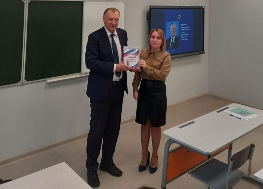 Поздравляя 4 ноября 2025 г. граждан России с праздником - Днем Народного Единства, Президент Российской Федерации В.В. Путин обратил внимание на важный аспект в жизни общества - патриотический аспект в деятельности всех трудовых коллективов. То есть на необходимость воспитания граждан страны в любви к своему Отечеству, не допуская ссор, распри, розни, вражды между этносами, нациями, народами, религиозными концессиями. Владимир Владимирович поддержал идею - объявить наступающий 2026 год - Годом Единства народов России! С целью реализации этих программных задач патриотического воспитания молодежи в Кочкуровской общеобразовательной средней школе на открытом уроке «Разговор о важном» состоялась встреча с членом Мордовского регионального объединения судей (РОС), судьей Верховного Суда Республики Мордовия в почетной отставке Мартышкиным В.Н. В ходе встречи с учащимися автор в дар библиотеке вручил зам. директора школы по воспитательной работе Елаевой Н.И. свою книгу «Патриотизм XXI века: уроки этики и права», которая завоевала золотую медаль на Всероссийском конкурсе «Судья Года». |